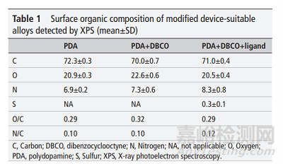 圖4 表面改性后的金屬X射線光電子能譜XPS,所表征的材料組成成分。DBCO,二苯并環(huán)辛炔
