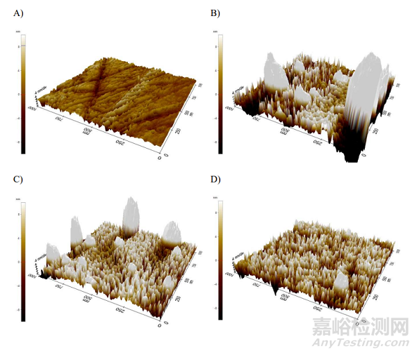圖5 原子力顯微鏡(Atomic force microscopy,AFM)下,(A)未改性、裸露鎳鈦樣品表面的非接觸下3D AFM圖像;(B)PDA浸涂接枝的鎳鈦金屬表面圖像;(C)PDA和DBCO連續(xù)浸涂接枝后的鎳鈦金屬表面圖像;(D)連續(xù)浸涂PDA、DBCO和一種DNA配體的鎳鈦金屬表面圖像