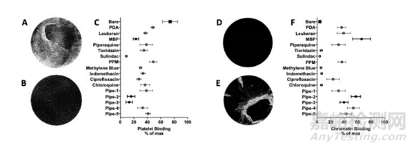 接下來(lái),考慮到毒性、可擴(kuò)展性和制造成本,研究者們選取了15種DNA相互作用劑進(jìn)行了本次研究。與裸鎳鈦金屬盤相比,所有涂層都表現(xiàn)出了與染色質(zhì)結(jié)合的增加,以及黏附血小板能力的降低。這其中,Pipe-2(哌嗪衍生物)和MBF涂層樣品的結(jié)果最好,MBF涂層的染色質(zhì)親和力增加了近三倍,血小板黏附減少了幾乎五倍。
