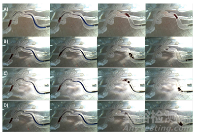 圖8 3D模型中不同Solitaire支架的取栓情況。(A)未修飾的Solitaire支架,(B)PDA涂層;(C)MBF涂層;(D)Pipe-2涂層(應(yīng)該大家都看得出用的是什么中間導(dǎo)管吧,雖然文中未提)(順便其它用的是0.014“Synchro微導(dǎo)絲和Rebar 18微導(dǎo)管)