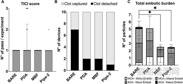 在使用大腦中動(dòng)脈MCA模型的臺(tái)架測(cè)試中,所有涂層的Solitaire支架在最多三遍后均能實(shí)現(xiàn)完全再通(TIMI 3級(jí))。與PDA和Pipe-2涂層相比,裸支架BMS和MBF涂層都顯示出了更高的首次通過(guò)再通率,但組間并無(wú)統(tǒng)計(jì)學(xué)差異。裸支架在整個(gè)試驗(yàn)過(guò)程中脫落的大栓子和微栓子數(shù)量都更大,與其相比,MBF涂層能夠顯著減少取栓過(guò)程中栓子的脫落(p=0.0211),如圖9和10。注意這里為與臨床實(shí)踐保持一致,操作者采用的是抽拉結(jié)合技術(shù)。