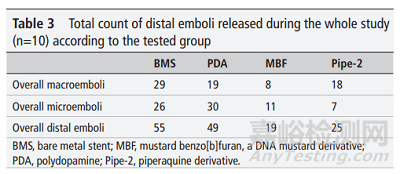 圖10 不同涂層的支架,在試驗(yàn)期間釋放的遠(yuǎn)端栓子數(shù)量比較