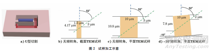 采用U型切割的方法將試樣薄片從塊體上分離,即在無傾轉(zhuǎn)角的條件下,從側(cè)邊將試樣加工成懸臂梁狀態(tài)[見圖2a)]。U型切割完成后,試樣從側(cè)面看呈梯形,假設(shè)所要分離的截面TEM薄片寬度為1.5μm,若從距頂端3μm的位置開始加工,試樣另一側(cè)的厚度約為4.17μm[見圖2b)]。當平面TEM試樣所要切割的試樣薄片寬度為10μm時,在無傾轉(zhuǎn)角的條件下進行加工,另一側(cè)的厚度約為10.8μm,在低束流下極有可能出現(xiàn)無法截斷的現(xiàn)象[見圖2c)]。用U型切割的方法制備平面TEM試樣時,將傾轉(zhuǎn)角度從0°調(diào)整為-10°,離子束入射位置調(diào)整為距頂端2μm,此時試樣另一側(cè)厚度約為7.8μm[見圖2d)]。該方法可有效降低試樣加工后另一側(cè)的厚度,即使在低束流的情況下也可以快速將試樣截斷、分離。
