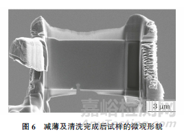 在試樣清洗階段,采用逐級降低離子束電壓的方法。首先在將離子束電壓和電流切換至5kV,0.041nA,將試樣傾轉(zhuǎn)至±4°,前、后表面交替對稱清洗試樣,清洗時間控制在30s,重復3次。完成后將離子束電壓和電流切換至2kV,0.028nA,試樣傾轉(zhuǎn)至±6°,繼續(xù)交替清洗30s,重復3~4次。減薄及清洗完成后試樣的微觀形貌如圖6所示。