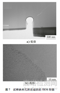 用雙球差矯正TEM對制備好的試樣納米孔附近組織進行觀察,結(jié)果如圖7所示??梢娫嚇右r度均勻,在高分辨模式下,納米孔附近組織可清晰呈現(xiàn)。說明制備的平面TEM試樣厚度達到要求且損傷層很少。