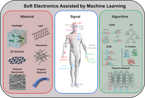 綜上所述,軟體電子與機(jī)器學(xué)習(xí)相輔相成,相關(guān)領(lǐng)域已經(jīng)取得了豐富的成果。因此中山大學(xué)生物醫(yī)學(xué)工程學(xué)院周建華/喬彥聰團(tuán)隊(duì)與清華大學(xué)集成電路學(xué)院任天令團(tuán)隊(duì)對(duì)該領(lǐng)域進(jìn)行詳細(xì)分析與總結(jié),在國(guó)際著名期刊Nano-Micro Letters上發(fā)表題目為“Soft Electronics for Health Monitoring Assisted by Machine Learning”的綜述論文,全文共86頁(yè),4萬(wàn)余詞。本文第一作者兼共同通訊作者為中山大學(xué)喬彥聰助理教授,中山大學(xué)周建華教授與清華大學(xué)任天令教授為通訊作者。該工作得到了國(guó)家自然基金重點(diǎn)項(xiàng)目與青年項(xiàng)目,科技部項(xiàng)目,廣東省自然科學(xué)基金項(xiàng)目,深圳市優(yōu)秀科技創(chuàng)新人才培養(yǎng)項(xiàng)目以及廣東省傳感技術(shù)與生物醫(yī)療儀器重點(diǎn)實(shí)驗(yàn)室的支持。本文詳細(xì)介紹了各種新型軟體電子材料,隨后回顧了基于這些軟體電子器件檢測(cè)的生理信號(hào),并重點(diǎn)回顧了機(jī)器學(xué)習(xí)的各種算法在軟體電子的應(yīng)用。最后討論了機(jī)器學(xué)習(xí)輔助的軟體電子系統(tǒng)的展望、挑戰(zhàn)和總結(jié)。