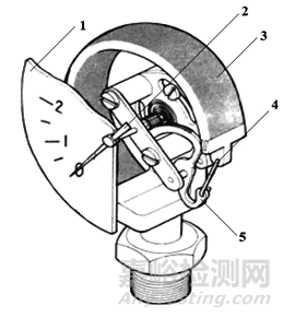 圖2 波登管就地壓力表外觀及內(nèi)部結(jié)構(gòu)圖(1為刻度盤;2為指針;3為波登管;4為傳動(dòng)桿;5為扇形齒輪)