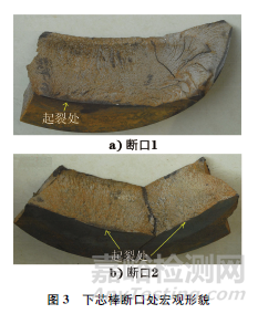 在下芯棒斷口處取樣進行宏觀觀察,結果如圖3所示。由圖3可知:斷裂為多源脆性斷裂,裂紋源起始于下芯棒R 角區(qū)域;裂紋由下芯棒R角處向內擴展,裂紋快速擴展區(qū)的面積最大,導致芯棒斷裂為多塊。
