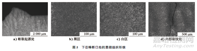 在下芯棒斷口處取樣,并進行金相檢驗,結果如圖5所示。由圖5可知:斷裂起源處可見一些微裂紋,起源處未見冶金缺陷,裂紋內未見夾雜物;試樣顯微組織不均勻,可見黑白區(qū),黑區(qū)顯微組織為索氏體,白區(qū)顯微組織為貝氏體;試樣內部可見鋸齒形裂紋,裂紋內未見非金屬夾雜物,裂紋處沒有發(fā)現明顯的缺陷;斷口的裂紋擴展形式為穿晶斷裂,判斷為脆性斷裂。