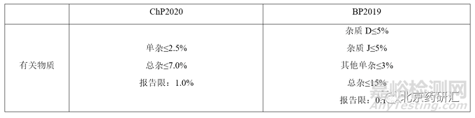 該品種在中國藥典和英國藥典中均有收載,各國藥典標準中的有關(guān)物質(zhì)限度對比如下。