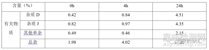 根據(jù)參比制劑穩(wěn)定性數(shù)據(jù)可知,雜質(zhì)含量與限度要求相差甚遠,該品種效期末配伍穩(wěn)定性數(shù)據(jù)如下表所示