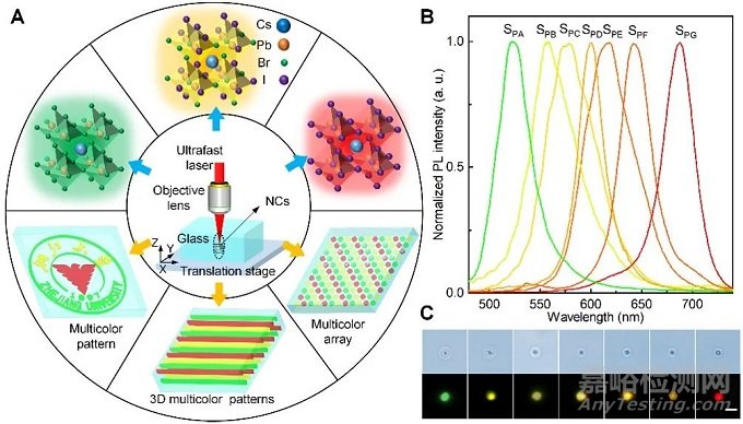 浙江大學(xué)邱建榮團(tuán)隊(duì)及其合作者們發(fā)現(xiàn)了飛秒激光誘導(dǎo)復(fù)雜體系微納結(jié)構(gòu)形成的新機(jī)制。以含氯溴碘離子的氧化物玻璃體系為例,實(shí)現(xiàn)了玻璃中具有成分和帶隙可控發(fā)光可調(diào)的鈣鈦礦納米晶3D直接光刻,呈現(xiàn)紅橙黃綠藍(lán)等不同顏色的發(fā)光。形成的納米晶在紫外線輻照、有機(jī)溶液浸泡和250℃高溫環(huán)境中表現(xiàn)出顯著的穩(wěn)定性。并進(jìn)一步演示了這種3D微納結(jié)構(gòu)在超大容量長壽命信息存儲、高穩(wěn)定的最小像素尺寸微米級的Micro-LED列陣,實(shí)現(xiàn)了1080p級別動(dòng)態(tài)立體彩色全息顯示。