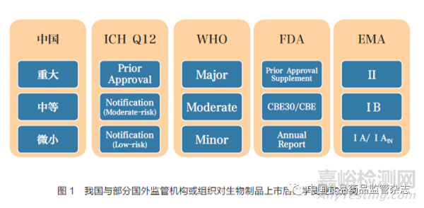 《變更指導原則》按照對安全、有效和質(zhì)量可控的風險和產(chǎn)生影響的程度,將已上市生物制品藥學變更依次分為重大變更、中等變更和微小變更。我國與部分國外監(jiān)管機構(gòu)或組織對生物制品上市后變更的分類如圖1 所示[3-7]。根據(jù)《藥品注冊管理辦法》,變更應當相應地以補充申請、備案和年度報告的方式進行管理。除重大變更、中等變更和微小變更外,通過以上方式進行管理的還有其他變更事項,如對于新增制劑規(guī)格等需要發(fā)放新藥品批準文號的上市后變更,隸屬國家藥監(jiān)局職責范圍,應當按照《藥品注冊管理辦法》相關要求申報補充申請[8]。此外,部分藥學變更事項對生物制品的物質(zhì)基礎產(chǎn)生影響的可能性較大,如疫苗佐劑變更,應考慮按照《生物制品注冊分類及申報資料要求》中改良型相關類別進行申報[9]。為了充分體現(xiàn)基于風險的管理理念,隨著生物制品行業(yè)的發(fā)展以及持有人內(nèi)部管理經(jīng)驗的積累,持有人在確保內(nèi)部PQS 穩(wěn)健的前提下,可以根據(jù)《藥品上市后變更管理辦法(試行)》對目前《變更指導原則》中已經(jīng)確定的分類級別進行降級管理,同時應與省級藥品監(jiān)管部門溝通,并在達成一致意見后實施。對于疫苗、細胞治療產(chǎn)品等生物制品的上市后變更,除參考《變更指導原則》開展研究外, 另有規(guī)定和技術要求的, 也應遵照執(zhí)行。