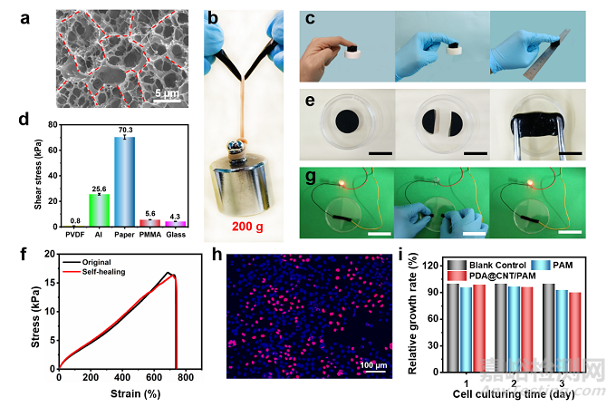 圖2.PDA@CNT/PAM水凝膠的基本性能表征