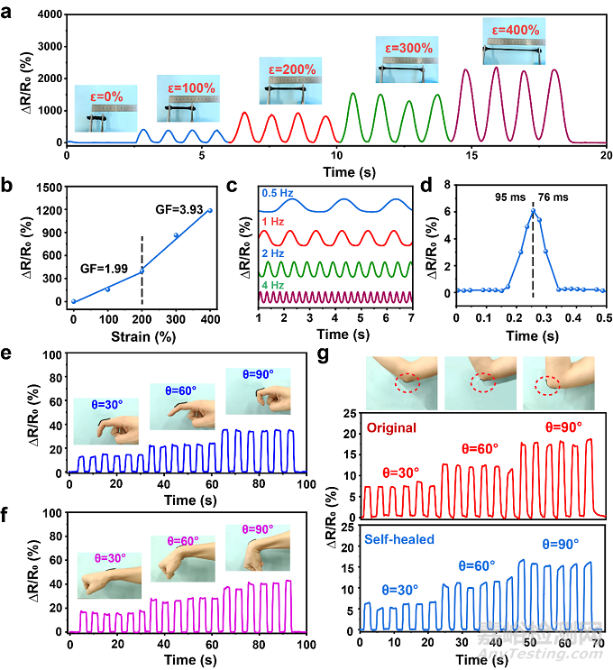 圖3. PDA@CNT/PAM水凝膠基應(yīng)變傳感器的性能測試
