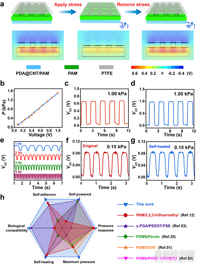 圖4. PDA@CNT/PAM水凝膠基摩擦納米發(fā)電機的性能測試