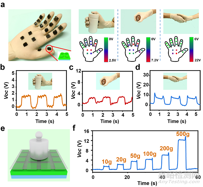 圖5. 基于PDA@CNT/PAM水凝膠摩擦納米發(fā)電機壓力傳感器所制備的智能手套和模擬天平來識別物體形狀、材料與稱量物體重量的應(yīng)用