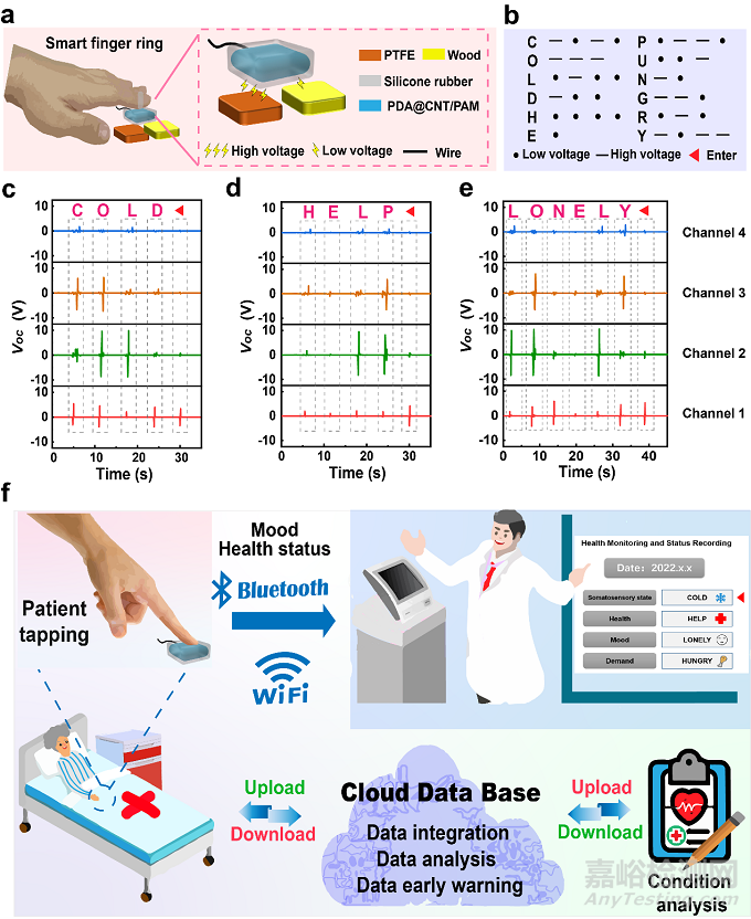圖6. PDA@CNT/PAM水凝膠摩擦納米發(fā)電機壓力傳感器作為智能指環(huán)通過摩斯密碼與人機交互實現(xiàn)病人與醫(yī)生之間的快速溝通的應(yīng)用。