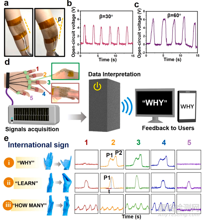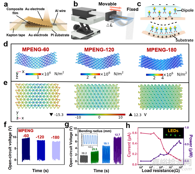 近期,四川大學(xué)高分子材料工程國(guó)家重點(diǎn)實(shí)驗(yàn)室陳英紅教授團(tuán)隊(duì)報(bào)道了一種結(jié)合固相剪切碾磨和3D打印技術(shù)制備基于可編程機(jī)械超材料設(shè)計(jì)的聚偏氟乙烯(PVDF)基電子皮膚新策略。該工作研究了離子鹽-蒙脫土(MMT)模板作用下PVDF電活性晶自組裝行為,利用熔融沉積成型3D打印取向技術(shù)剪切誘導(dǎo)MMT填料模板的定向排列,改善了復(fù)合材料壓縮塑性形變,并實(shí)現(xiàn)平行于應(yīng)力方向的界面鎖定極化(圖1)。進(jìn)一步通過(guò)構(gòu)建蛇形機(jī)械超材料單元的周期性排列結(jié)構(gòu)以精準(zhǔn)調(diào)控材料的應(yīng)力應(yīng)變行為,結(jié)果表明超材料單元的側(cè)向屈曲和擴(kuò)張行為賦予了3D打印壓電器件反常規(guī)的負(fù)泊松比力學(xué)特性,即器件在拉伸應(yīng)變下橫縱向同時(shí)發(fā)生膨脹,實(shí)現(xiàn)了壓電器件對(duì)皮膚等復(fù)雜曲面的良好貼合和自適應(yīng),有望解決常規(guī)穿戴式傳感器嚴(yán)重限制皮膚自由運(yùn)動(dòng)的缺陷。在此基礎(chǔ)上,通過(guò)揭示器件受蛇形超材料單元操縱的機(jī)電耦合理論,開發(fā)了具備可編程設(shè)計(jì)、自決策等特性的先進(jìn)壓電納米發(fā)電機(jī)(圖2)。研制的超材料電子皮膚極大拓展了PVDF基壓電材料的設(shè)計(jì)空間,展現(xiàn)了運(yùn)動(dòng)監(jiān)測(cè)、手語(yǔ)傳譯等一系列智能可穿戴應(yīng)用前景(圖3)。