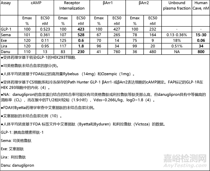 與利拉魯肽相比,danuglipron被認(rèn)為是cAMP信號的偏向激動劑(4)。但是,需要注意的是,受體內(nèi)吞的潛力與脫敏的潛力有關(guān),而脫敏潛力應(yīng)該在體內(nèi)藥動背景下進(jìn)行評估,最好用游離藥物濃度/受體內(nèi)吞體外EC50值進(jìn)行評估。通過對比高劑量GLP-1 RAs的人體平均濃度,發(fā)現(xiàn)danuglipron的受體內(nèi)化潛力要遠(yuǎn)高于大分子肽類。