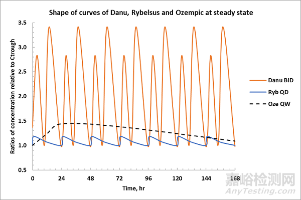 圖Figure 1: Comparisons of PK fluctuations of oral daily semaglutide (Ryb), subcutaneous weekly semaglutide (Oze) and oral daily danuglipron (Danu).