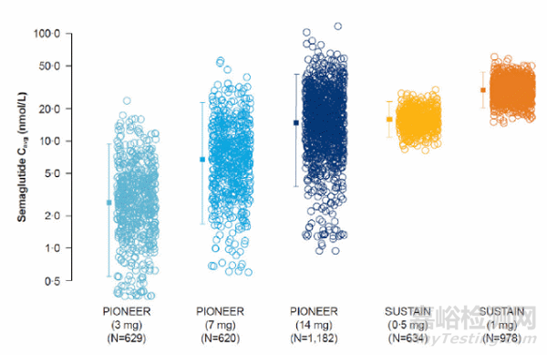 Rybelsus和Ozempic的暴露(Cave)和HbA1c降低作用幾乎相同,二者的Emax模型幾乎一致,EC50約為6.5 nM(14)。Rybelsus每日口服劑量為7mg和14 mg,PK變異性很大(圖3),低于遠(yuǎn)高于Ozempic的每周0.5和1 mg(圖2),這可能解釋Rybelsus在HbA1c降低較小。Rybelsus更高劑量(20mg和50 mg)正處于后期臨床階段,可能是為了提高血糖控制和肥胖適應(yīng)癥(Novo Nordisk正在研發(fā)中)。