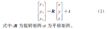 假設(shè)點(diǎn)P為物體表面上的測(cè)試點(diǎn)和研究點(diǎn),那么其坐標(biāo)既能在世界坐標(biāo)系下用點(diǎn)(x,y,z)表示,又能在相機(jī)三維坐標(biāo)系下用點(diǎn)(x1,y1,z1)表示。點(diǎn)P從世界坐標(biāo)系轉(zhuǎn)換為相機(jī)三維坐標(biāo)系的坐標(biāo)變換矩陣如式(1)所示。