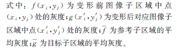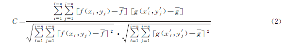 數(shù)字圖像相關(guān)法的關(guān)鍵是相關(guān)運(yùn)算,即依靠預(yù)定義的相關(guān)函數(shù)完成變形前、后圖像子區(qū)的相關(guān)計(jì)算。相關(guān)函數(shù)用來(lái)描述兩幅圖像的匹配程度,常見(jiàn)的相關(guān)函數(shù)有直接相關(guān)函數(shù)、協(xié)方差相關(guān)函數(shù)、標(biāo)準(zhǔn)化相關(guān)函數(shù)、標(biāo)準(zhǔn)化協(xié)方差函數(shù)、差平方和法、序貫相似性檢測(cè)函數(shù)等。標(biāo)準(zhǔn)化協(xié)方差(C)函數(shù)的表達(dá)式如式(2)所示。