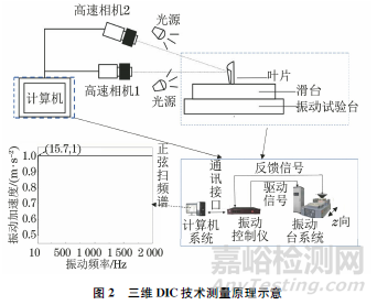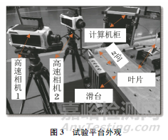 在振動(dòng)試驗(yàn)過(guò)程中,采用VIC-3D系統(tǒng)對(duì)葉背表面的應(yīng)變場(chǎng)及變形量進(jìn)行測(cè)量,該系統(tǒng)主要包括三腳架,兩臺(tái)發(fā)光二極管(LED)光源、標(biāo)定組件、散斑制作工具、VIC-Snap圖像采集系統(tǒng)和VIC-3D圖像處理系統(tǒng)。為了采集葉片的第一階固有頻率(500Hz)振動(dòng)試驗(yàn)過(guò)程中葉背表面清晰的散斑圖像,采用兩臺(tái)高速相機(jī)和兩個(gè)高速鏡頭,拍攝速率設(shè)置為4000幀/s,分辨率為512像素×640像素,一個(gè)振動(dòng)周期可采集8幅圖像。采用五口網(wǎng)絡(luò)交換機(jī)實(shí)現(xiàn)兩臺(tái)高速相機(jī)的圖像數(shù)據(jù)傳輸,兩臺(tái)相機(jī)設(shè)置為主從方式,通過(guò)外部觸發(fā)裝置實(shí)現(xiàn)圖像同步采集,搭建的試驗(yàn)平臺(tái)外觀如圖3所示。