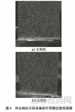 散斑圖像采集分為靜態(tài)拍攝階段和動(dòng)態(tài)拍攝階段。正弦振動(dòng)試驗(yàn)之前,葉片處于靜止?fàn)顟B(tài),手動(dòng)觸發(fā)兩臺(tái)高速相機(jī),使兩臺(tái)相機(jī)同步采集一組葉背表面散斑圖像,并將所得結(jié)果作為參考圖像,以給出每個(gè)圖像子區(qū)中心在變形前的位移原點(diǎn)。兩臺(tái)相機(jī)分別采集的葉背靜態(tài)散斑圖像如圖6所示。葉片振動(dòng)達(dá)到試驗(yàn)量值(500Hz)且穩(wěn)定后,在很短的時(shí)間間隔內(nèi)(約1s),相機(jī)所采集的一系列葉背動(dòng)態(tài)散斑圖像約為4000幅,將散斑圖像傳輸?shù)接?jì)算機(jī)內(nèi),并利用VIC-3D軟件進(jìn)行計(jì)算,可以得到葉片共振時(shí)的應(yīng)變分布及最大變形。