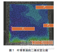 利用VIC-3D軟件對(duì)兩臺(tái)高速相機(jī)采集到的散斑圖像進(jìn)行分析處理,并采用拉格朗日(Lagrange)算法進(jìn)行計(jì)算,得到的葉背表面二維應(yīng)變?cè)茍D(第3