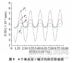 利用軟件在葉背表面的根部設(shè)置多個(gè)節(jié)點(diǎn),測(cè)得葉根處的z軸最大位移位于P0點(diǎn),P0點(diǎn)位于葉根中心位置附近。利用軟件在葉背的邊緣位置設(shè)置4個(gè)單點(diǎn)(P0、P1、P2、P3,見(jiàn)圖7),并得到這4個(gè)單點(diǎn)在5個(gè)正弦振動(dòng)周期內(nèi)沿z軸方向的位移曲線(見(jiàn)圖8)。由圖8可知:葉根附近P0點(diǎn)的最大位移為0.0473mm,而激光測(cè)振儀測(cè)得葉片根部中心位置的位移為0.0457mm。因此,VIC-3D系統(tǒng)測(cè)量最大位移與激光測(cè)振儀測(cè)量最大位移的相對(duì)誤差約為3.5%。