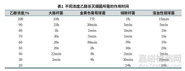 ①濃度。乙醇殺菌最佳濃度為70%~75%(V/V)。此濃度下既能使組成細菌的蛋白質(zhì)凝固,又不會形成阻擋乙醇分子繼續(xù)向菌群內(nèi)部滲透的保護包膜,同時該濃度下其滲透壓與細菌菌體滲透壓相近,可以在細菌表面蛋白質(zhì)未變性前不斷地向其內(nèi)部滲入,達到殺滅的濃度、劑量,也就能徹底將外、中、里層的全部細菌殺滅,達到徹底消毒的目的和效果。所以,乙醇類消毒劑的最佳濃度應為70%~75%(V/V)。同時,水對乙醇發(fā)揮殺菌作用非常必要,因此用于消毒時需要對乙醇進行稀釋,但濃度低于30%時殺菌作用很小。過濃或過稀的乙醇,殺菌作用都有所降低。不同濃度乙醇殺滅細菌所需作用時間見表1。