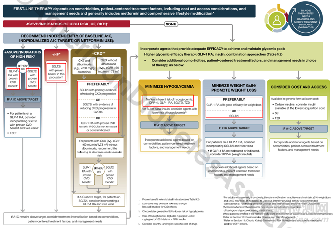 從注射到口服,我們認為現(xiàn)在再開發(fā)GLP-1 RA 類似的新分子的臨床和商業(yè)的意義都非常有限, 除非從臨床效果或者原料成本上具較大優(yōu)勢。企業(yè)應(yīng)該更側(cè)重于價值大的項目。比如,GLP-1 RA 和SGLT2i組合。或者新的潛力靶點,如Amylin,PYY,等。例如,禮來的雙靶點激動劑tirzepatide展示了優(yōu)秀的臨床表現(xiàn)以及令人暢想的市場價值。諾和諾德 的Amylin/GLP-1組合,信達的GLP-1/GCGR雙靶點,在二期臨床上也有不俗的表現(xiàn)。特別是GLP-1和SGLT2i的組合用,其臨床價值大。二者的機理不一樣,但在降糖、減重,尤其是心血管收益方面,有大量的臨床數(shù)據(jù)支持二者可以產(chǎn)生疊加或協(xié)同作用(18, 19, 20, 21)。目前,全球醫(yī)學界幾乎一致性的在2型糖尿病的指南里,因SGLT2或GLP-1藥物的降體重和心血管受益,都將它們列為了二甲雙胍控糖不足以后的主要推薦藥物(圖2,圖3)??紤]這兩類藥物的協(xié)同效應(yīng),如果實現(xiàn)經(jīng)濟上可接受的GLP-1RA和SGLT2i復(fù)方,使得病人第一時間在二甲雙胍控糖不足時,就能同時獲益GLP-1和SGLT2二種不同而且有疊加/協(xié)調(diào)功能的治療手段, 將為2型糖尿病的治療帶來巨大的價值。
