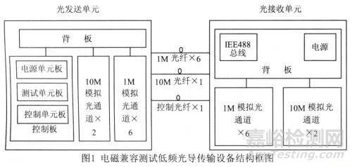 EMC測試低頻光導(dǎo)傳輸設(shè)備由光發(fā)送單元和光接收單元組成。光發(fā)送單元由背板、控制板(包括電源單元、測試信號發(fā)生器單元及控制電路單元)、1OMHz通道發(fā)送板(2通道)以及1MHz通道發(fā)送板(6通道)組成;光接收單元由背板(包括電源單元、IEEE488接口單元)、10MHz通道接收板(2通道)以及1MHz通道接收板(6通道)組成。如圖1所示。