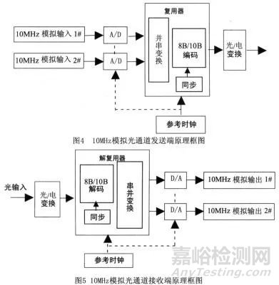2路10MHz模擬光傳輸通道的信號頻帶為DC~10MHz,采用模數(shù)一數(shù)模的全數(shù)字調(diào)制方式,在單芯單模光纖中以1 3 1 Onm波長激光傳輸。發(fā)送時對2個模擬傳輸通道高速采樣,進(jìn)行A/D轉(zhuǎn)換,通過光電轉(zhuǎn)換電路,再復(fù)用到一根光纖上傳輸;反之,接收時,首先對從光纖上來的高速數(shù)字信號解復(fù)用成數(shù)字信號,進(jìn)行D/A轉(zhuǎn)換,還原成模擬信號。圖4和圖5為10MHz通道的原理框圖。由于10 MHz通道的傳輸信號頻率已經(jīng)比較高,為保證信號質(zhì)量,本方案的2個10 MHz通道均采用8位A/D、D/A轉(zhuǎn)換器,采樣速率為6O MHz,理論上10 MHz通道的信噪比SNR≈(6.02N+1.76)dB,可達(dá)48dB(用戶要求為36dB)。