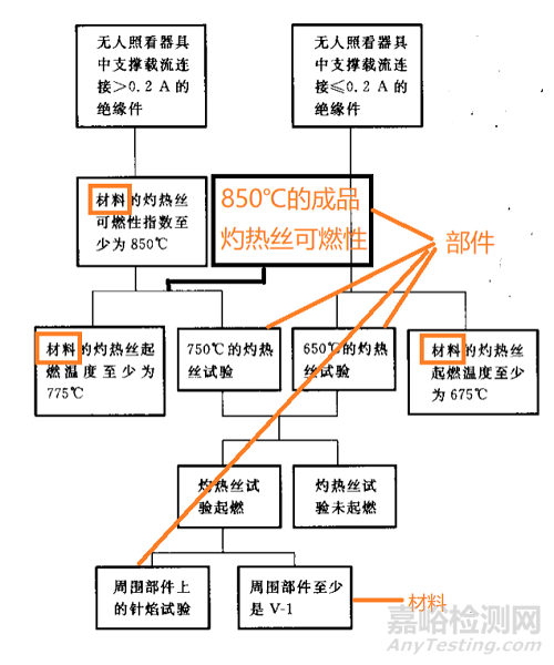 30.2.3.1 無人看照器具,載流>0.2A的支撐絕緣部件,以及連接處3mm范圍內(nèi)的材料,需要通過850℃的灼熱絲測試,這里的灼熱絲測試可以是GB/T 5169.11的GWEPT,也可以是GB/T5169.12的GWFI,前面分析過這兩測試的判定要求基本一致,只是一個針對成品,一個針對材料。