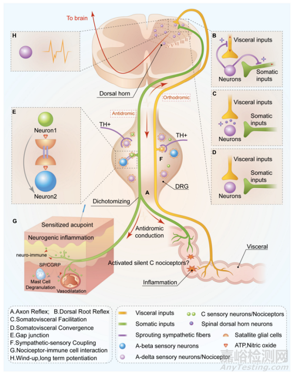 2) 中醫(yī)穴位機理研究:中醫(yī)經絡穴位的機理是近年的研究熱點。痛覺感受器是穴位的反應器之一,負責針灸操作并將針灸信號傳遞到脊柱或椎上水平。最近的證據表明,各種疾病導致致敏穴位的感覺超敏和功能可塑,即穴位致敏。神經源性炎癥是致敏穴位的主要病理特征;然而,穴位致敏的潛在機制尚不清楚。近年來的研究報道,沉默C-痛覺受體(silent C-nociceptors, SNs),在組織損傷或內臟功能障礙的情況下,會被感覺末梢和免疫細胞釋放的炎癥物質“喚醒”。SNs可由健康狀態(tài)下的機械不敏痛覺受體轉變?yōu)闄C械敏痛覺受體。激活的SNs是否參與穴位敏化的機制,并參與針刺手法機械信號的傳遞還尚在研究階段。