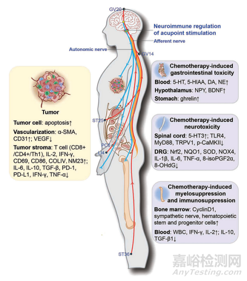 3) 穴位刺激治療化療副作用、促進癌癥治療的機理研究:包括化療誘導的周圍神經病變(CIPN)、認知障礙(CICI)、胃腸道毒性(GI)以及骨髓抑制和免疫抑制。穴位刺激可通過降低氧化應激和神經炎癥,調節(jié)背根神經節(jié)、脊髓背角和十二指腸的5羥色胺系統(tǒng),從而減弱CIPN和GI。穴位刺激還可以激活孤束核的迷走神經活動,促進胃腸道神經肽激素的分泌,從而緩解胃腸道癥狀。穴位刺激可恢復骨髓造血功能和免疫功能,以對抗癌癥。此外,穴位刺激與化療相結合可通過促進腫瘤細胞凋亡和化療藥物在腫瘤組織中的富集,調節(jié)腫瘤免疫微環(huán)境和血管正?;瘉硪种颇[瘤生長。多種證據表明,穴位刺激的作用可能與神經免疫調節(jié)有關,如下圖所示的穴位刺激聯(lián)合化療治療癌癥的潛在神經免疫調節(jié)機制[3]。