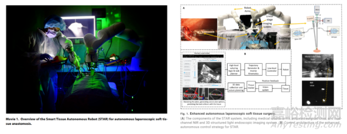 1) 軟組織手術機器人自主操作:2022年,來自約翰·霍普金斯大學的研究團隊設計出一款智能軟組織自主機器人 STAR, 并將其成果發(fā)表在Science Robotics雜志上。該機器人在沒有人類指導的情況下,成功完成對一頭豬的軟組織腹腔鏡手術。這是軟組織手術機器人向自主手術操作方向邁出的重要一步。STAR 的特別之處在于,它是第一個幾乎不需要人工干預規(guī)劃、調整和執(zhí)行軟組織手術計劃的機器人系統(tǒng)。研究團隊為 STAR 配備了增強自動性和改善手術精度的新功能,這些功能包括專門的縫合工具和最先進的成像系統(tǒng),可提供更為精確的手術區(qū)域的可視化。由于軟組織形變的不可預測性,軟組織手術對機器人自動控制來說尤其困難,因為它們必須具備快速應對意外變化的適應能力。而 STAR 具備的新型控制系統(tǒng)使其能像人類外科醫(yī)生一樣實時調整手術計劃。