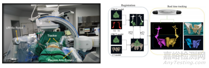 2) 硬組織手術機器人自主操作:2022年,北京積水潭醫(yī)院和北京航空航天大學共同研發(fā)出智能化骨折復位機器人,完成了臨床應用并發(fā)表在《Journal of Clinical Medicine》上。移位性骨盆骨折是創(chuàng)傷性骨科中最復雜的骨折之一,骨折復位是手術的重要過程,要求在大負載下完成骨折塊精準的6自由度位置和姿態(tài)調整。該團隊設計的手術機器人,通過實時三維導航和力位協(xié)同控制,實現(xiàn)了機器人自主操作下的骨盆骨折閉合復位,推動骨科手術機器人從定位導航、輔助操作向自主操作方向發(fā)展。