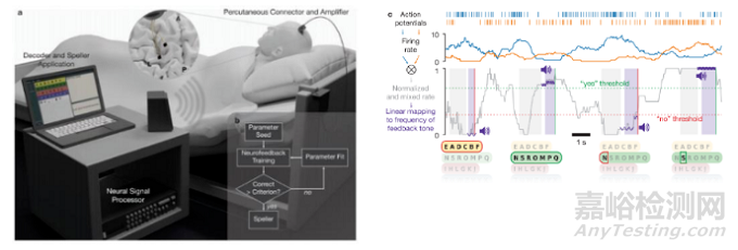 1) 腦電信號編碼實現(xiàn)文字交流:2022年3月22日,發(fā)表在Nature Communications上的一項研究,讓一位37歲的ALS患者在沒有任何自主肌肉控制的情況下,通過形成單詞和短語進行交流。該系統(tǒng)包括將一個帶有微電極的設備植入患者的大腦,并使用一個定制的計算機軟件來幫助翻譯他的大腦信號。兩個微電極陣列放置在中央前回和額上回。神經信號在神經信號處理器上進行預處理,并在電腦上進一步利用機器學習模型實時處理和解碼。每日神經反饋訓練中如果達到性能標準,則患者開始使用拼寫;如果沒有達到標準,則根據神經反饋數(shù)據重新估計參數(shù),并進行進一步的訓練。這種人工智能工具將符號映射為“是”或“否”的含義,借助拼寫程序會讀出字母表中的字母,最終破譯參與者想要交流的內容,直到形成完整的單詞,該系統(tǒng)可實現(xiàn)大約每分鐘一個字符的速度造句。