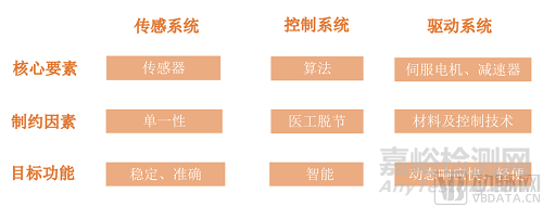 具體來看,傳感系統(tǒng)、控制系統(tǒng)、驅動系統(tǒng)的核心要素、制約因素及目標功能如下: