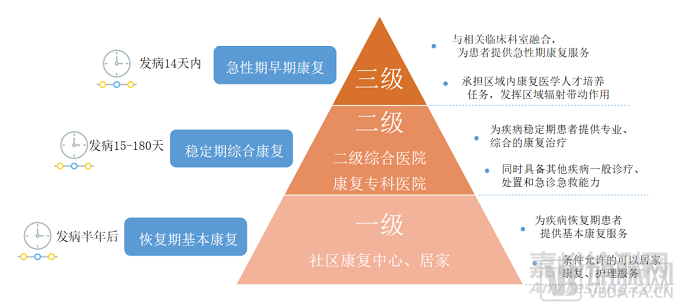 三級康復醫(yī)療分級服務體系是國際上比較認同的模式,結合康復階段的三級診療體系如下圖: