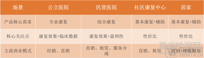 從產(chǎn)品的角度分析,產(chǎn)品的功能、適用的人群、各場景資源等影響其商業(yè)模式。我們綜合康復階段與主要場景,對現(xiàn)有主流商業(yè)模式做梳理如下:
