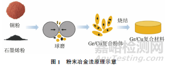 粉末冶金法是將石墨烯粉與銅粉通過球磨等方式混合,然后經(jīng)過壓制與燒結(jié)進(jìn)行致密化而獲得石墨烯增強銅基復(fù)合材料(Gr/Cu復(fù)合材料)的一種方法,其原理如圖1所示。