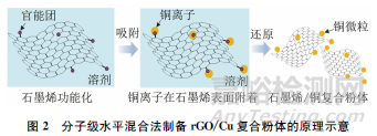 分子級水平混合法通過將氧化石墨烯(GO)與銅氨等含有Cu2+的溶液混合,使Cu2+吸附到GO表面,并在還原氣氛下高溫還原或使用水合肼(分子式N2H4·H2O)等強還原劑還原,得到還原氧化石墨烯(rGO)與銅的復(fù)合粉體,其原理如圖2所示;再經(jīng)燒結(jié)后制得石墨烯增強銅基復(fù)合材料。