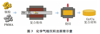 化學(xué)氣相沉積法是以聚甲基丙烯酸甲酯(PMMA)或甲烷等含碳有機物為碳源,在一定反應(yīng)條件下直接在基體金屬表面生成石墨烯從而得到復(fù)合粉體或石墨烯薄膜,再經(jīng)燒結(jié)制得復(fù)合材料的工藝,其原理如圖3所示。