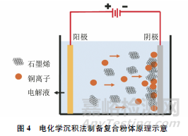 電化學(xué)沉積法是通過施加電流使沉積液中的石墨烯與銅在陰極金屬表面沉積得到復(fù)合粉體顆粒,如圖4所示,再經(jīng)過洗滌、干燥、還原與燒結(jié)制備復(fù)合材料的工藝。