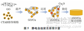 靜電自組裝法使用十六烷基三甲基溴化銨(CTAB)在片狀銅粉表面引入正電荷,再通過超聲處理與GO溶液混合,二者在電荷作用下相互吸附形成復(fù)合漿料,再經(jīng)干燥、還原、燒結(jié)制備得到復(fù)合材料,其原理如圖5所示。